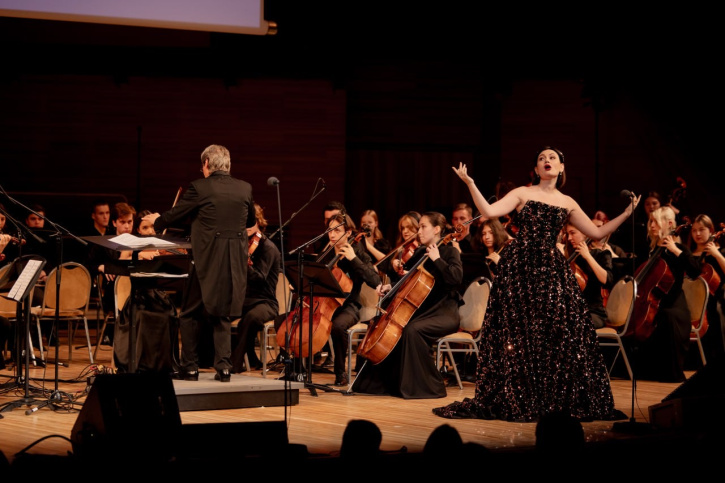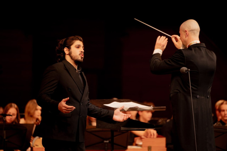 The aria of Rodolfo from the opera «La Bohème» by Giacomo Puccini was performed with orchestral accompaniment by David Sanikidze, a 2021 graduate of the Gnesin Music College, winner of the project «The Voice» (2025), soloist of the Stanislavsky and Nemirovich-Danchenko Moscow Academic Music Theatre, and guest soloist of the Bolshoi Theatre of Russia.