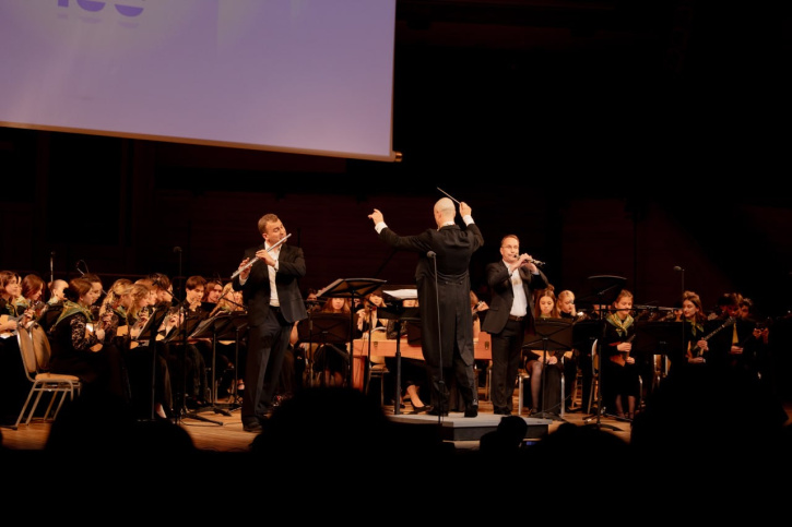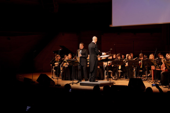 Then, the Russian Folk Orchestra of the Gnesin Music College, under the direction of Vladimir Shkurovsky, presented the Overture to the film «The Children of Captain Grant» by Isaac Dunayevsky in an arrangement by Shkurovsky, «Concertino» for saxophone by Jacques Ibert (soloist — Leonid Drutin, Head of the Department of Orchestral Wind and Percussion Instruments at the Gnesin Music College), and the Dance of Kozelkov and Friends from the ballet «The Bolt» by Dmitri Shostakovich in an arrangement by Shkurovsky.