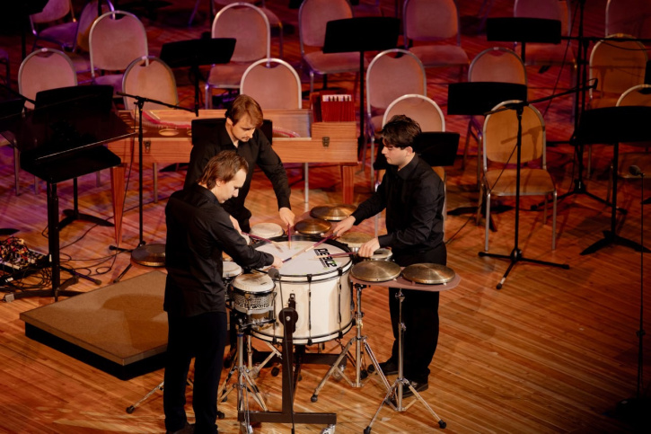 In the first part of the concert, the student choir of the Department of Solo Folk Singing (directed by Zhanna Rusakova) performed the song of the Don Cossacks, «Oh, You, Russia.» The concert continued with «Trio per uno» by Nebojša Živković, performed by students of the Department of Percussion Instruments: Vladislav Zavarykin, Denis Zhukov, and Semyon Shchetinin.